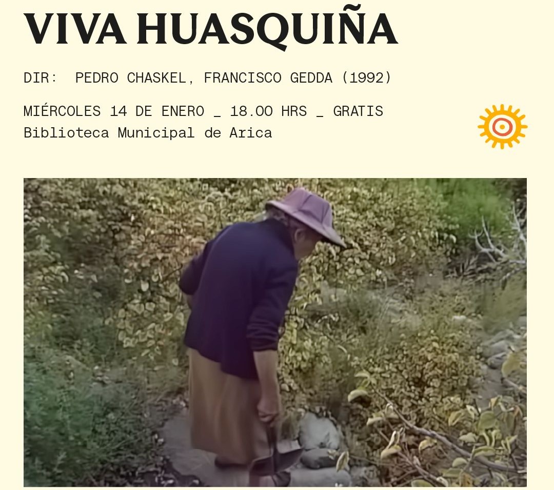 “Viva Huasquiña” un emocionante documental -que forma parte del ciclo de programas de “Al Sur del Mundo”- se exhibirá este miércoles 7 de enero (18 horas), en Cineforos de AricaDoc en trabajo conjunto con Sur Imagen, el cual se desarrolla con el financiamiento del Ministerio de las Culturas, las Artes y el Patrimonio a través de apoyo a Organizaciones Culturales Colaboradoras; y la Ilustre Municipalidad de Arica.