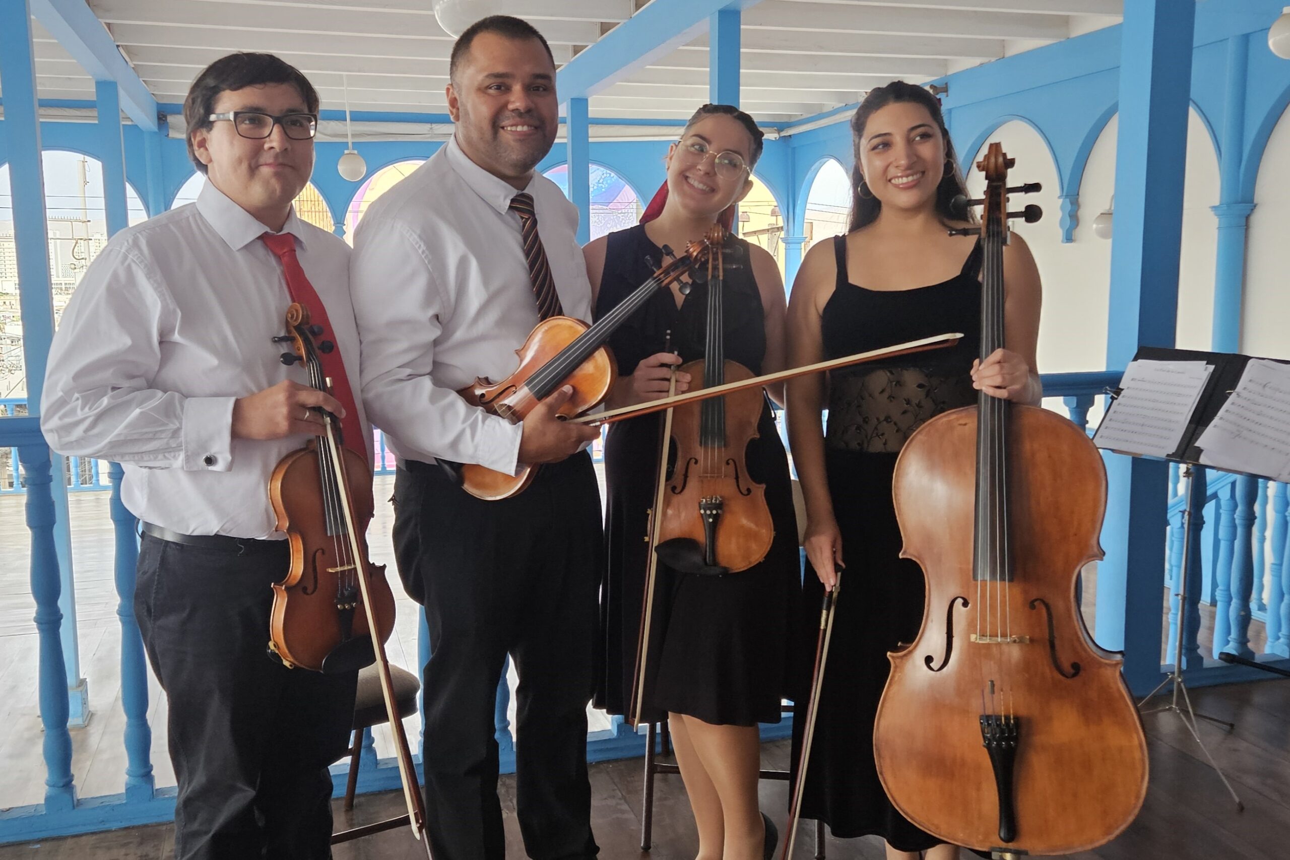 Con un repertorio que incluyó melodías del folclore peruano, el cuarteto cuerdas de la Fundación para las Artes y el Desarrollo Humano (FA) rindió un homenaje en el Día Nacional del Pisco Sour que celebró el Consulado General del Perú en Arica, en la histórica Casa Bolognesi ubicada en el casco céntrico de Arica.