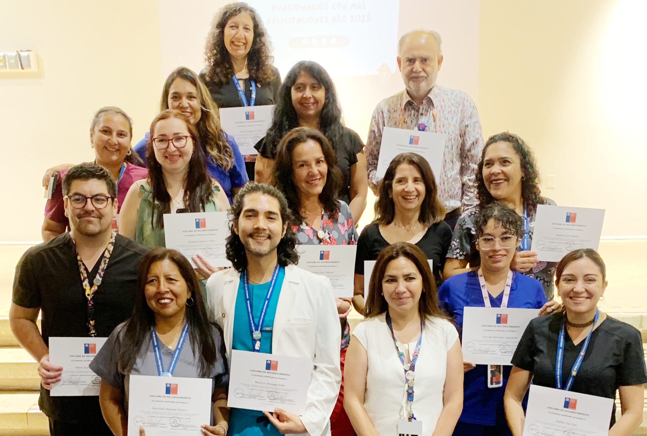 Las personas que recibieron diplomas fueron: Andrea Tejo, Priscilla Moraleda, Marlene Karl, Macarena Mayorga y Mauricio Alcayaga del Centro de salud ambiental; Mario Acuña, Evelyn Peredo, Farah Awad, Clyo Rojas y Oriana Andrade de la Unidad de atención primaria oftalmológica (UAPO), y Rogelio Moraga, Elcira Verdugo y Viviana Abarca del Programa de atención integral y reparación en salud (PRAIS).